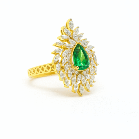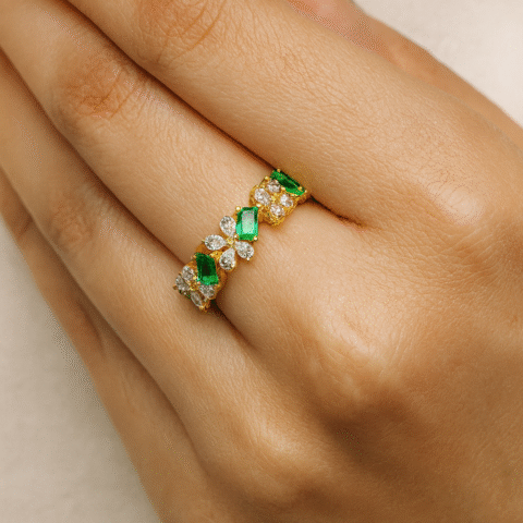 925 Silver 18KT Yellow Gold Plated Green Emerald Diamond Ring | Korean Design Luxury Women’s Jewelry | Customizable Statement Ring