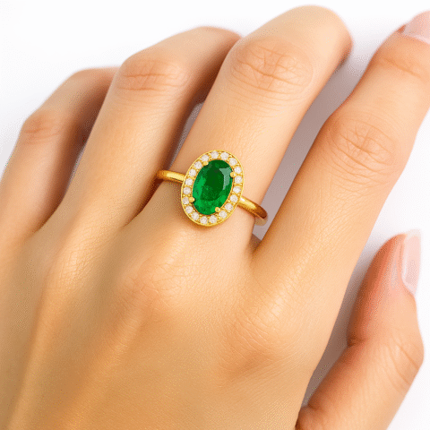 925 Silver Emerald Halo Gold Ring for Women | 18K Gold Oval Emerald Ring