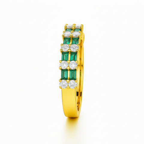 925 Silver Emerald and Diamond Eternity Band in 18K Yellow Gold | Green Stone Wedding Ring for Women”