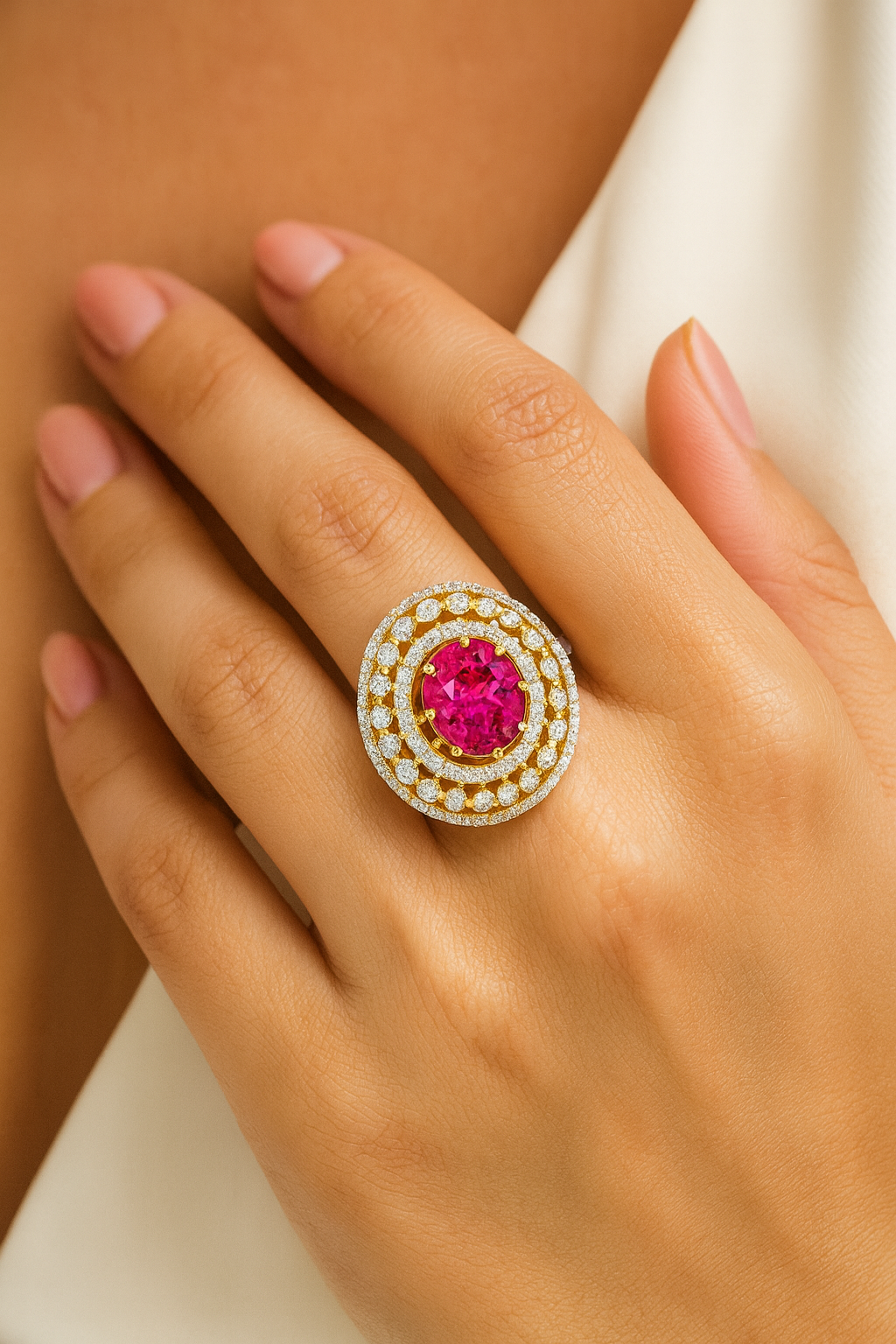 Red ruby jewellery is known for its cultural value — associated with positivity, confidence and strong feminine energy. Whether worn solo or paired with bangles, the ring instantly elevates any outfit, from sarees and lehengas to gowns and modern wear.