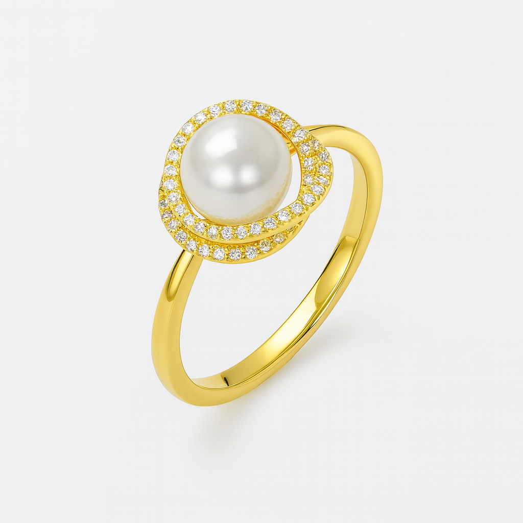 925 Silver & 18K Gold Pearl Ring with Diamond Halo | Women’s Pearl Engagement Ring”